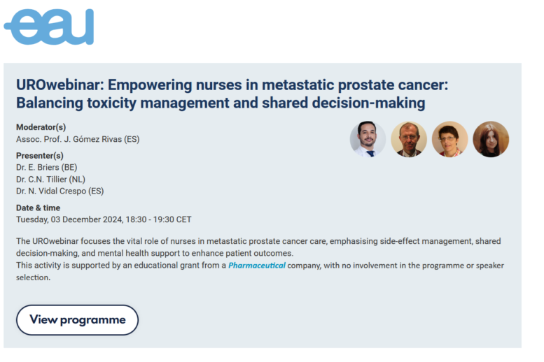 Spoštovani člani, Vabimo vas, da se udeležite UROwebinarja z naslovom “Opolnomočenje medicinskih sester pri zdravljenju metastatskega raka prostate: ravnovesje med obvladovanjem toksičnosti in soudeležbo pri odločanju“, kjer boste prisluhnili vodilnim strokovnjakom na tem področju. Ključne novosti na tem področju bodo predstavili naslednji ugledni strokovnjaki Evropske šole za urologijo: Moderator: izr. prof. J. Gómez Rivas (Španija) Predavatelji: dr. E. Briers (Belgija), … Read More