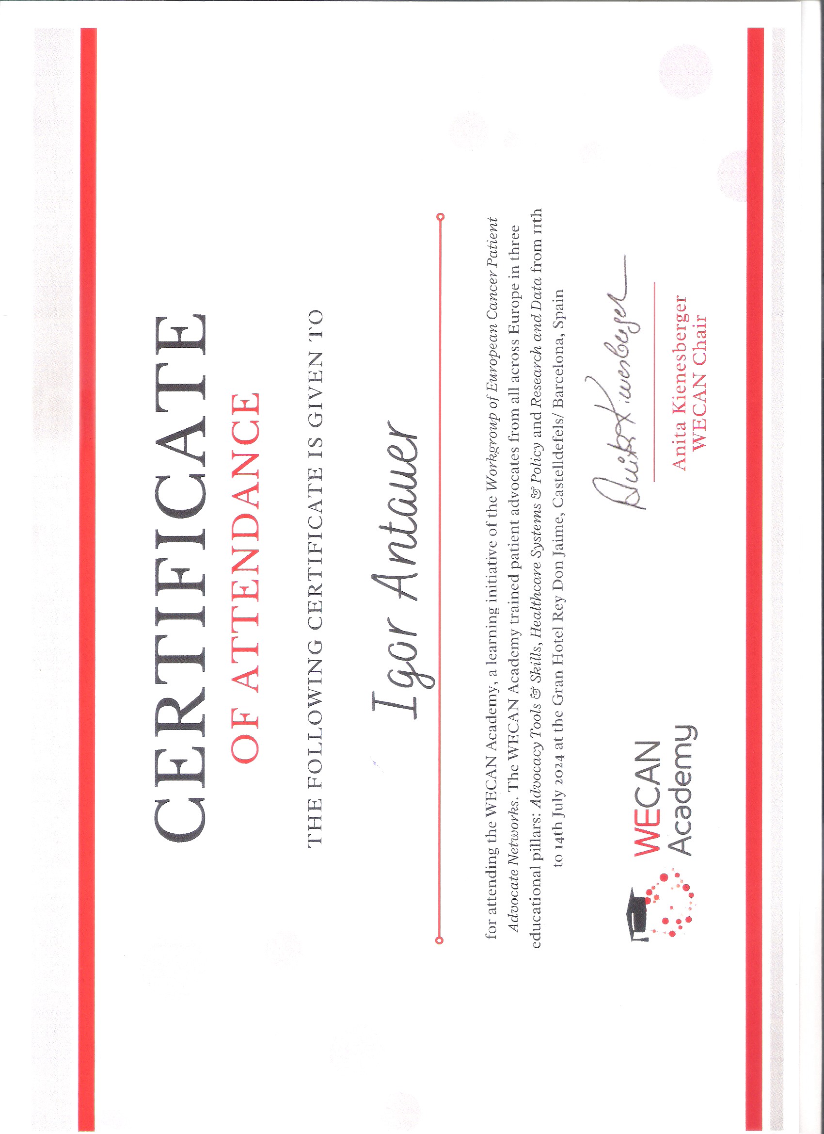 Predsednik društva g. Antauer se je v Barceloni med 10 in 13.7.2024 udeležil WECAN Akademije za zastopnike onkoloških pacientov, kjer je zastopal interese onkoloških bolnikov Društva uroloških bolnikov Slovenije.